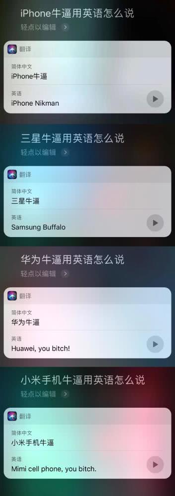 網(wǎng)友測(cè)試發(fā)現(xiàn),當(dāng)向蘋(píng)果siri提問(wèn)“華為牛逼用英語(yǔ)怎么說(shuō)”,Siri將其翻譯成“Huawei,you bitch”。當(dāng)把主語(yǔ)換成小米時(shí),也會(huì)出現(xiàn)“you bitch”內(nèi)容。而當(dāng)主語(yǔ)換成蘋(píng)果時(shí),翻譯為:Apple is so awesome。